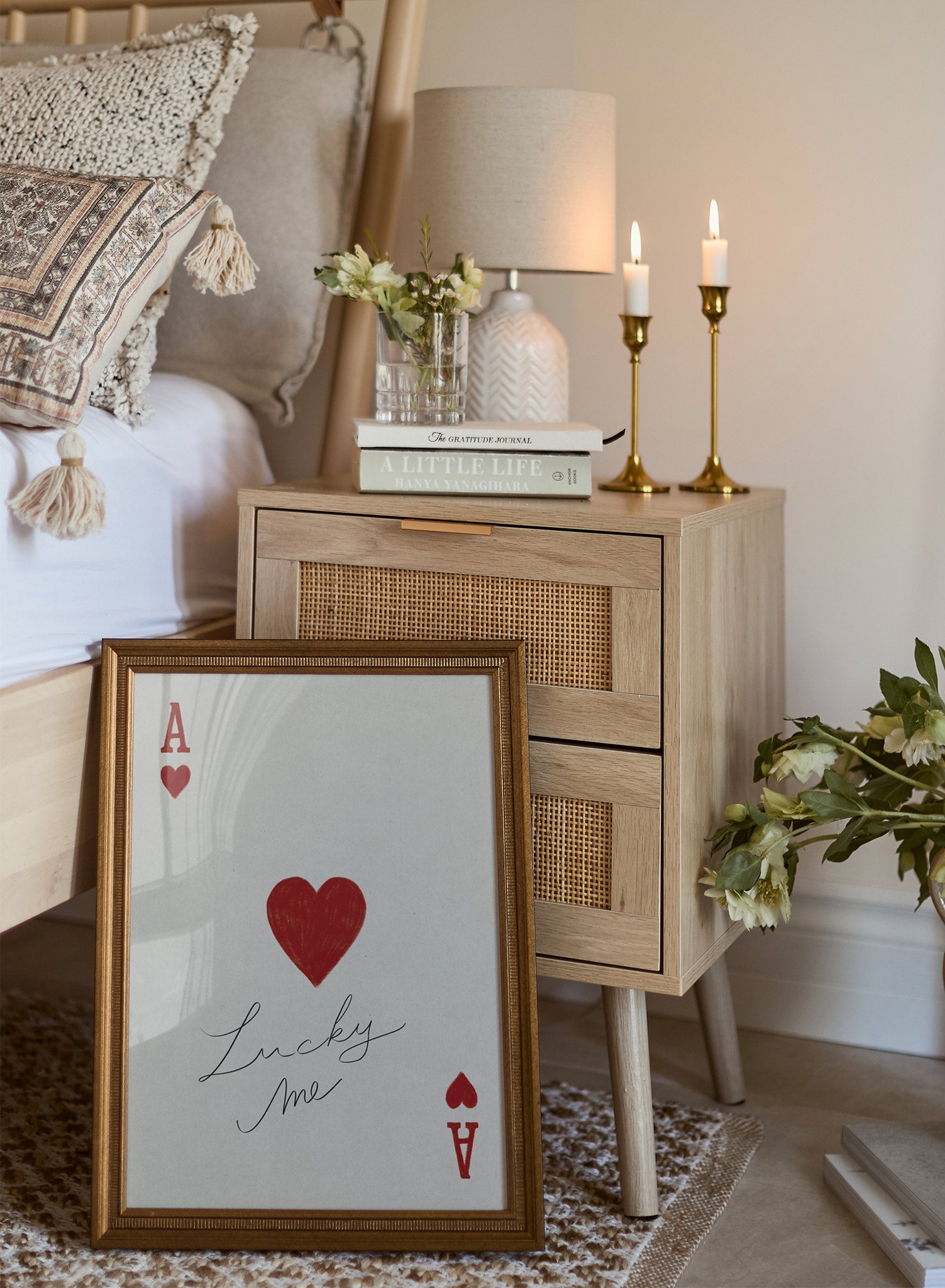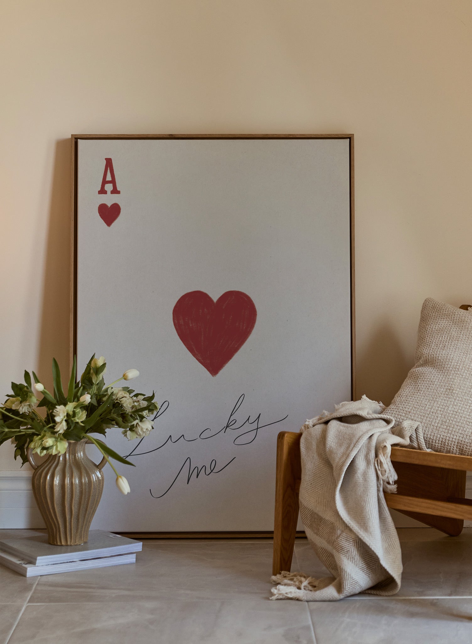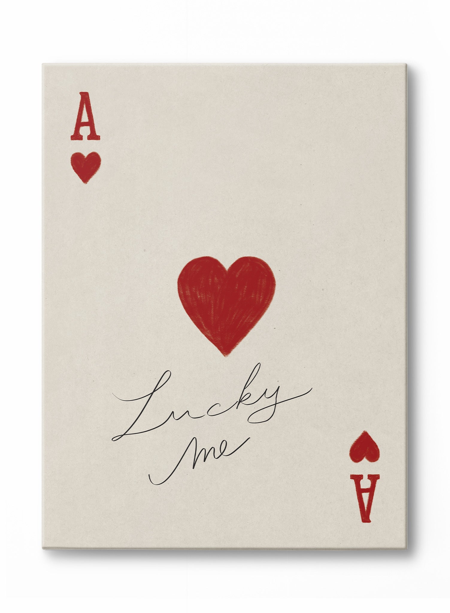 This charming print captures a playful nod to romance with a red ace of hearts card design, punctuated by the handwritten phrase “Lucky Me.” The central heart, sketched with a textured and organic feel, adds warmth and character to this minimal composition.