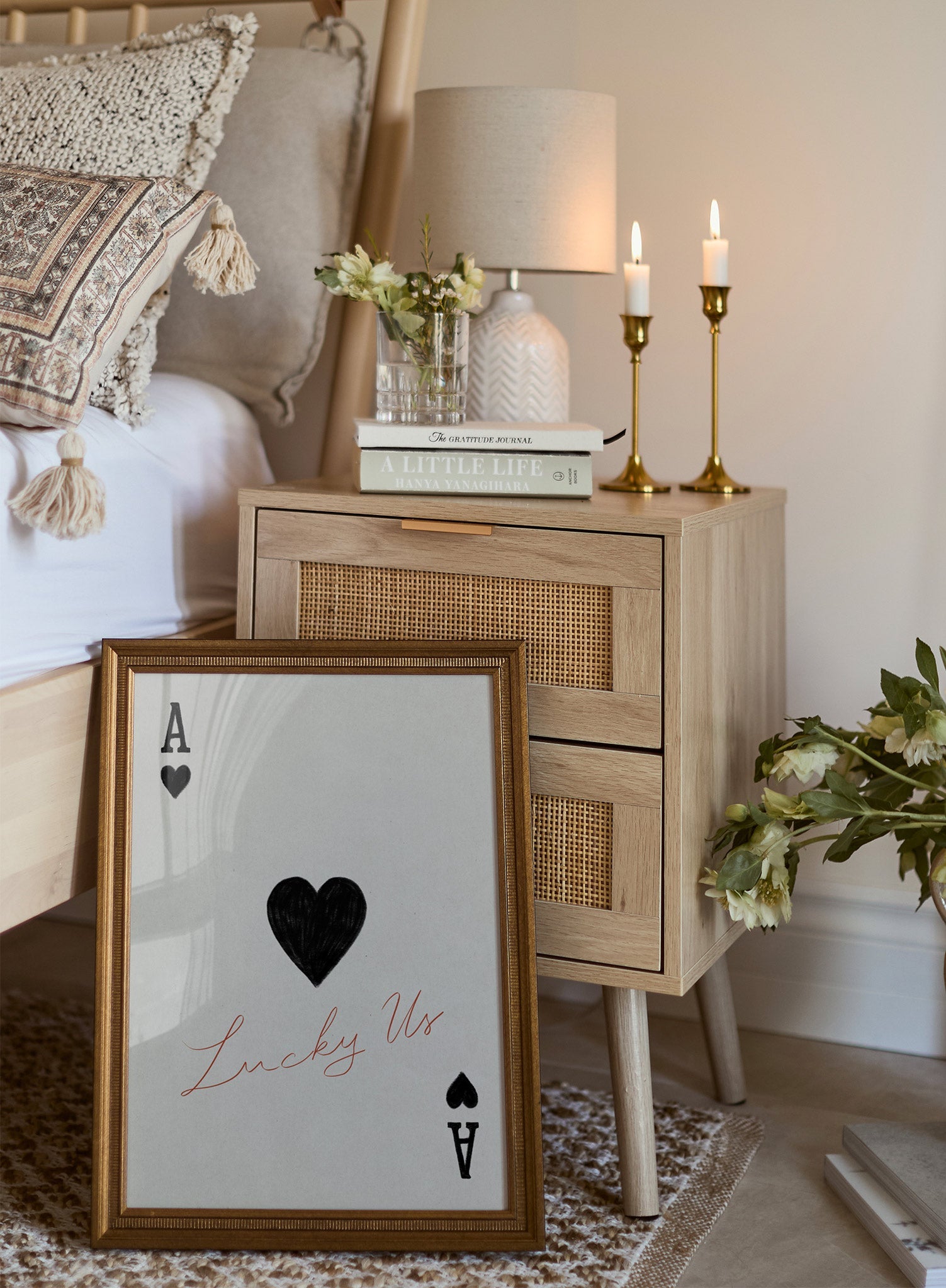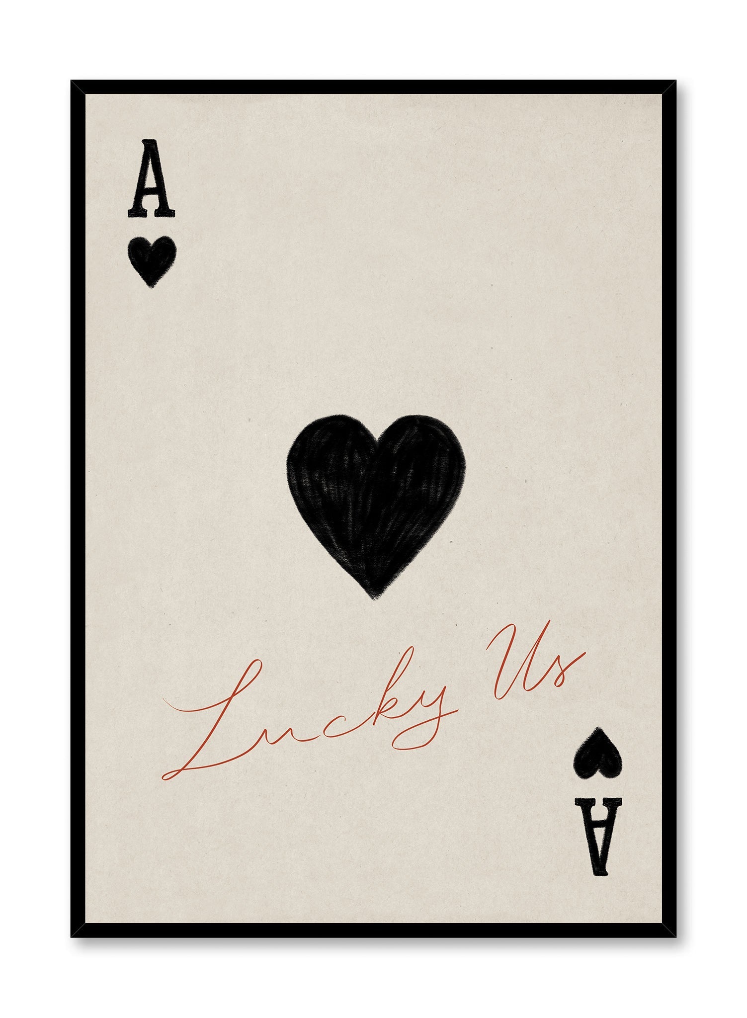 This sophisticated print reimagines the ace of hearts with a modern twist, featuring a textured black heart at the center and the handwritten phrase “Lucky Us” in elegant red script. The striking contrast between the black and red elements against the soft beige backdrop creates a bold yet refined design.