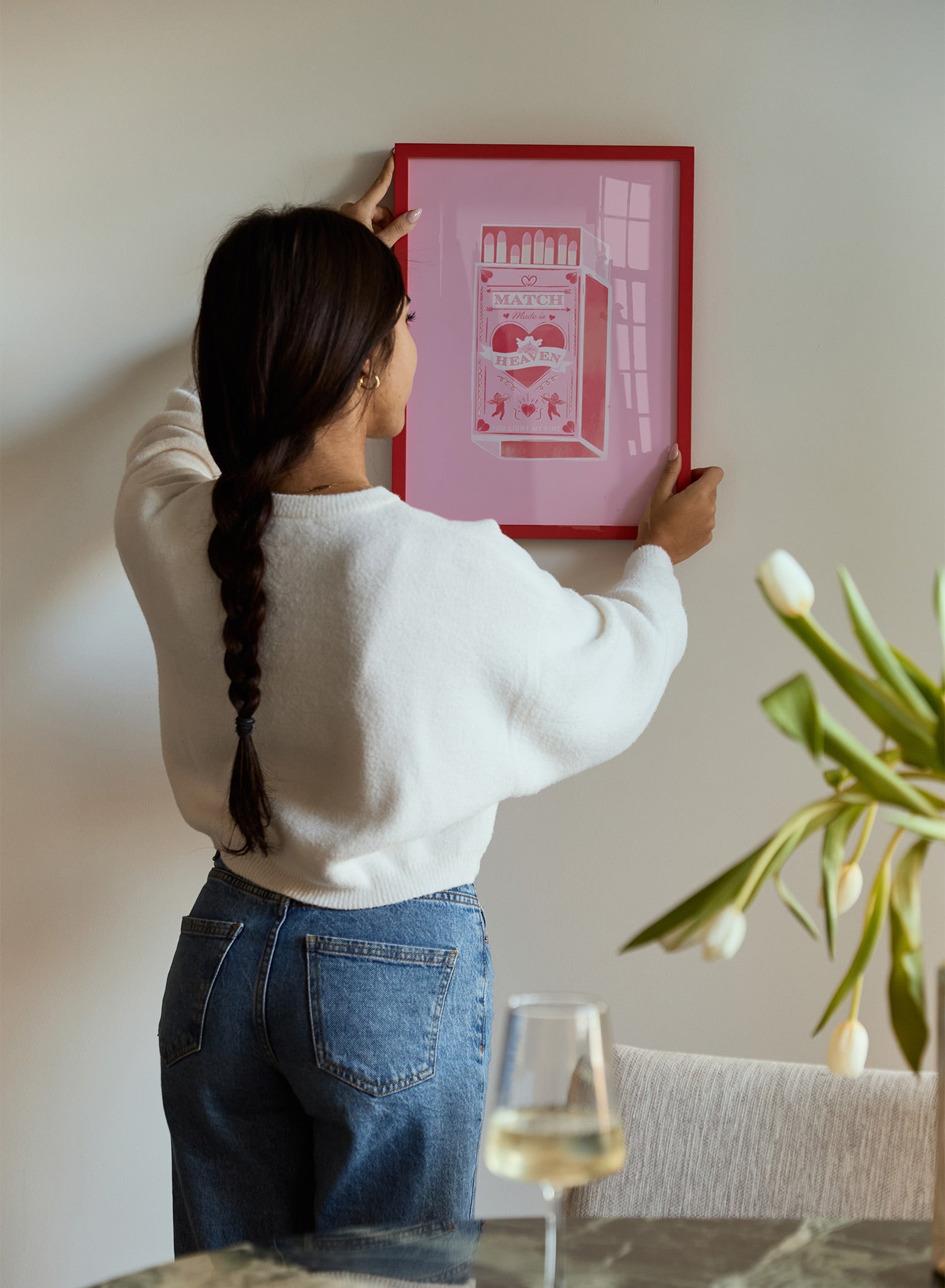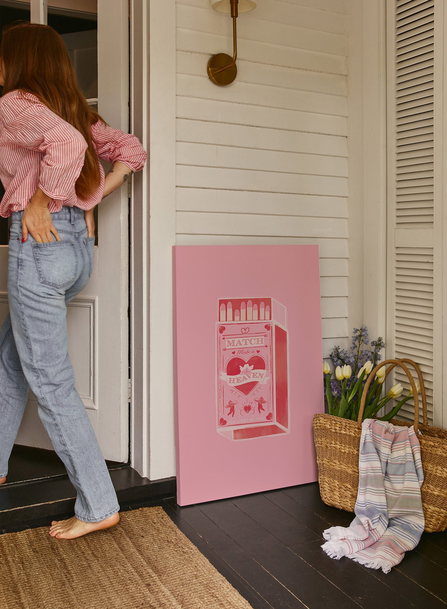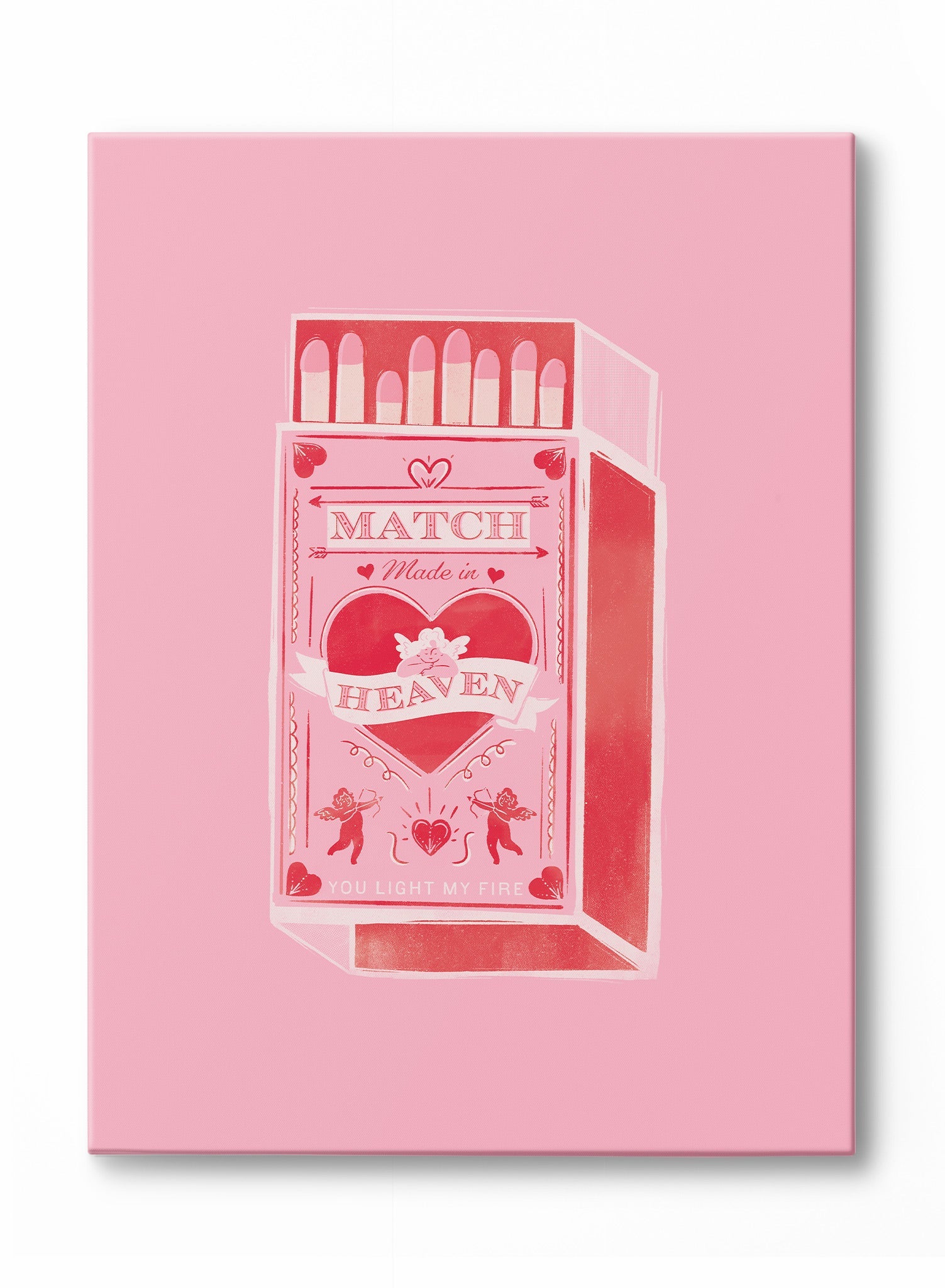 This vibrant print adds a spark of fun and romance with its vintage-inspired matchbox design, featuring the playful phrase “Match Made in Heaven.” The lively pink hues and intricate details, including cherubic figures and a bold heart motif, evoke nostalgia while celebrating connection.