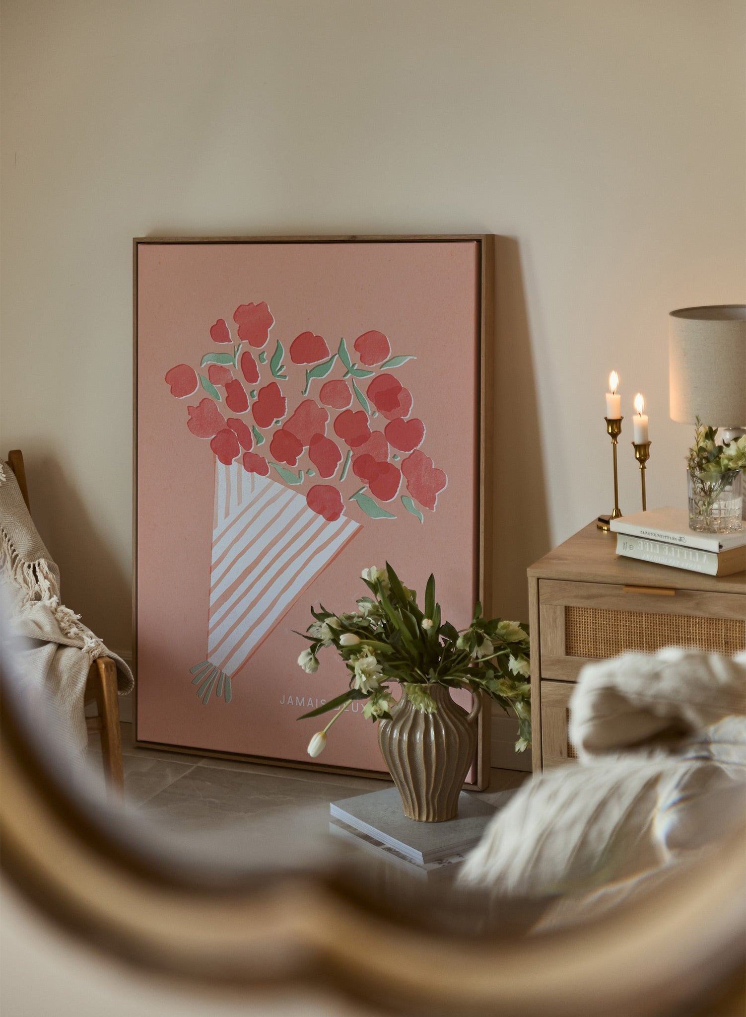This cheerful and poetic print features a vibrant bouquet of red blooms wrapped in a striped paper cone, set against a warm coral background. The French phrase “Jamais Deux Sans Toi,” translating to “Never two without you,” adds a romantic and heartfelt sentiment, making this piece both visually striking and emotionally resonant.